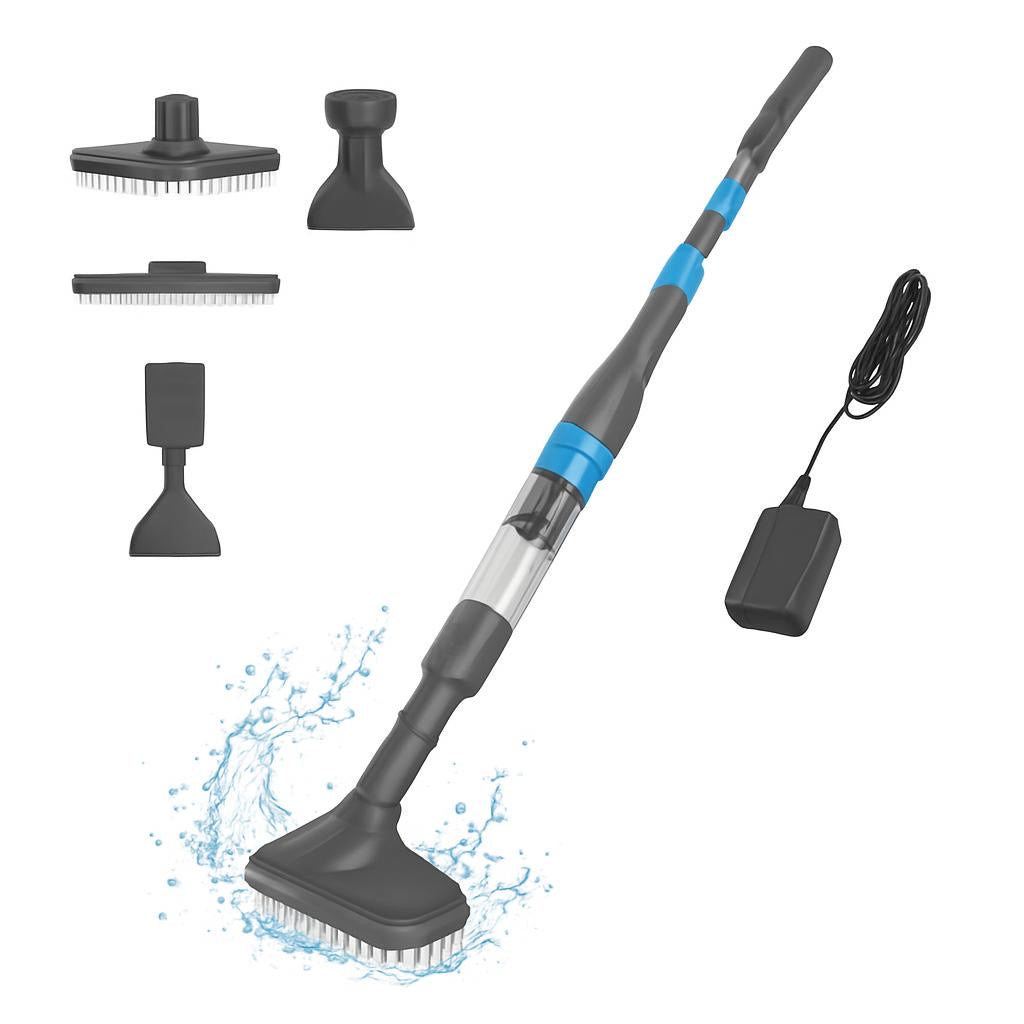 Kurzbeschreibung: Kabelloser, wiederaufladbarer Akku-Poolsauger mit Aluminiumgehäuse (Grau), 3‑in‑1-Aufsätzen, herausnehmbarem Filter und ca. 1,5 Std. Laufzeit (Ladezeit ~2 Std.). Ideal für kleine Aufstell- und Whirlpools.